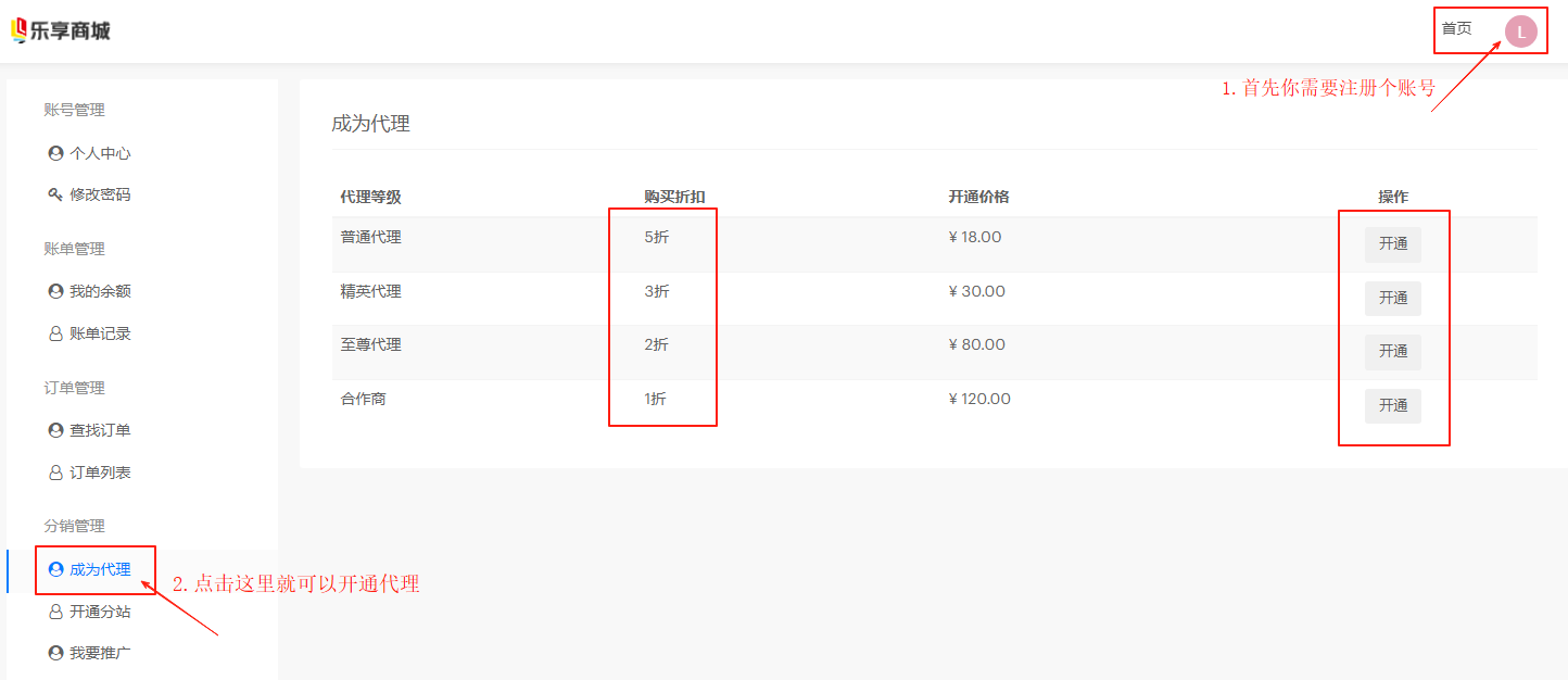 操作步骤:首先去站内注册账号、注册好后,左上角点击个人中心—分销管理—成为代理既可。